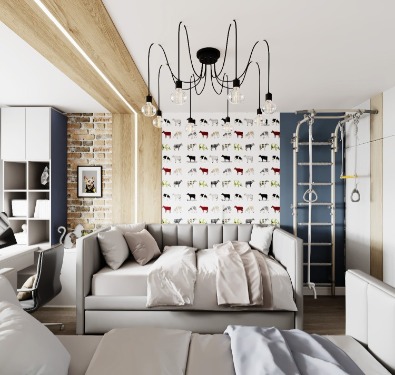 Дизайн детской в современном стиле с креативными обоями, 15 м2